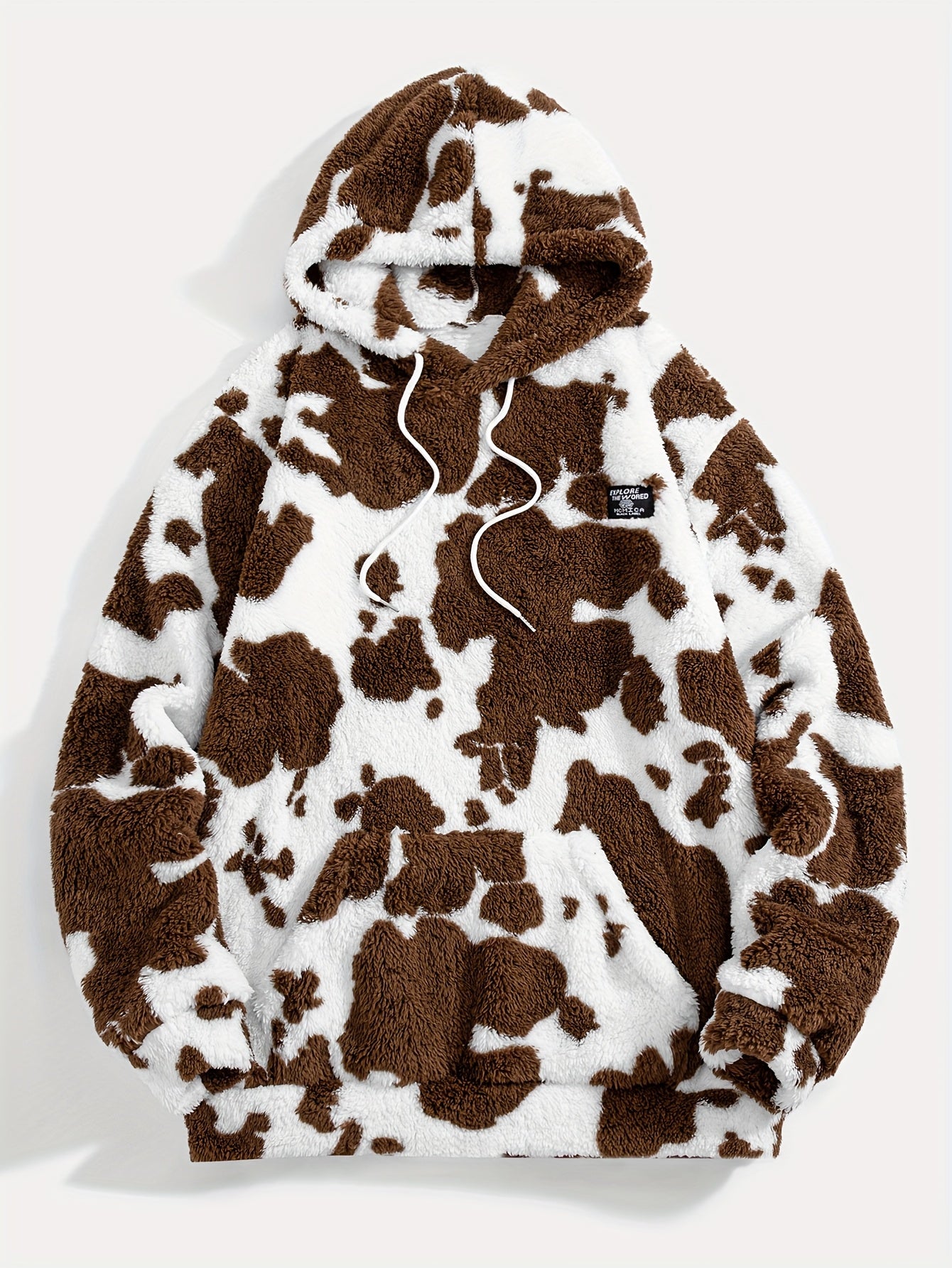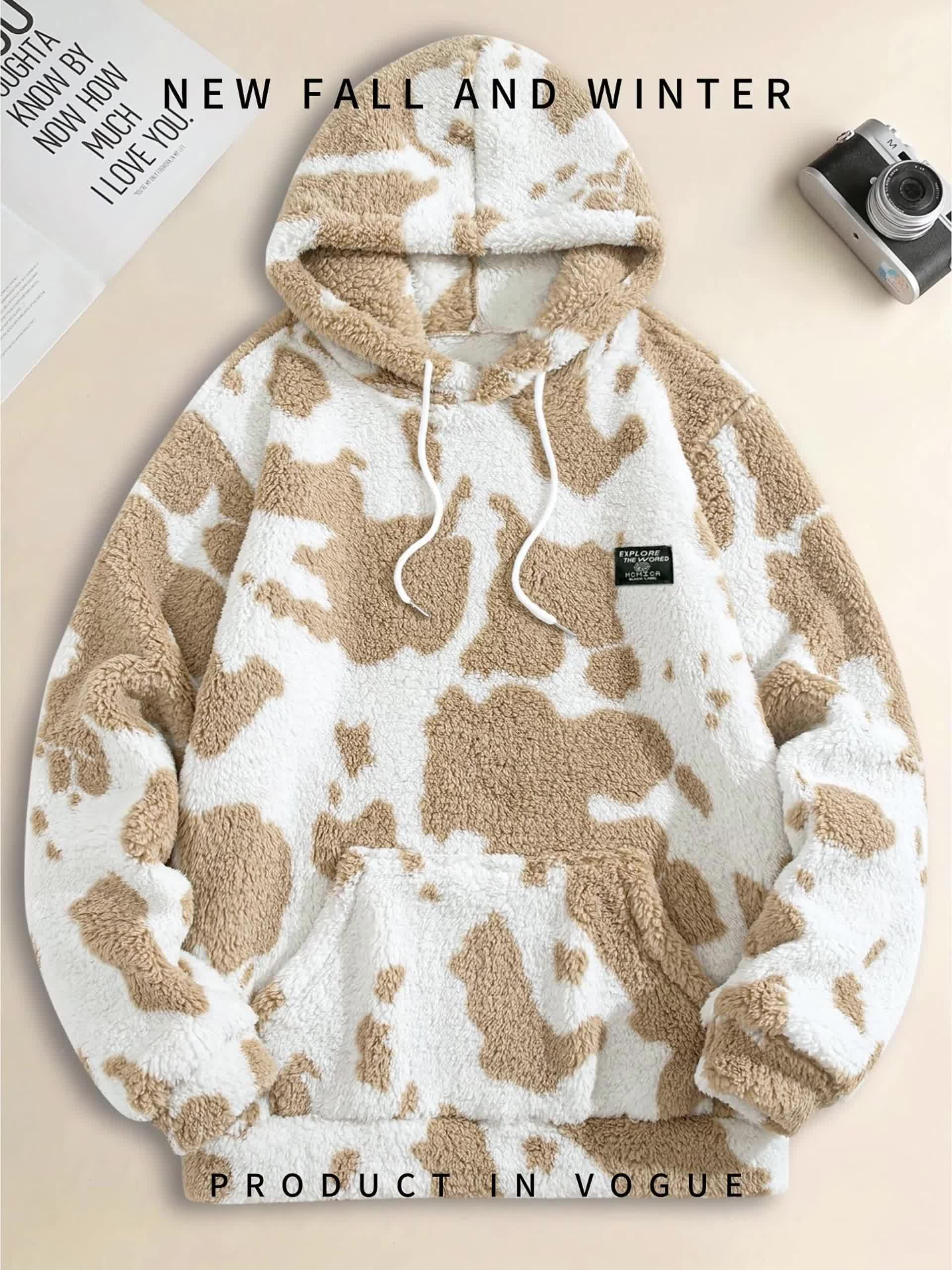 1pc Men'S Plush Hooded Sweatshirt - Soft Warm Winter Pullover with Brown & Cow Print