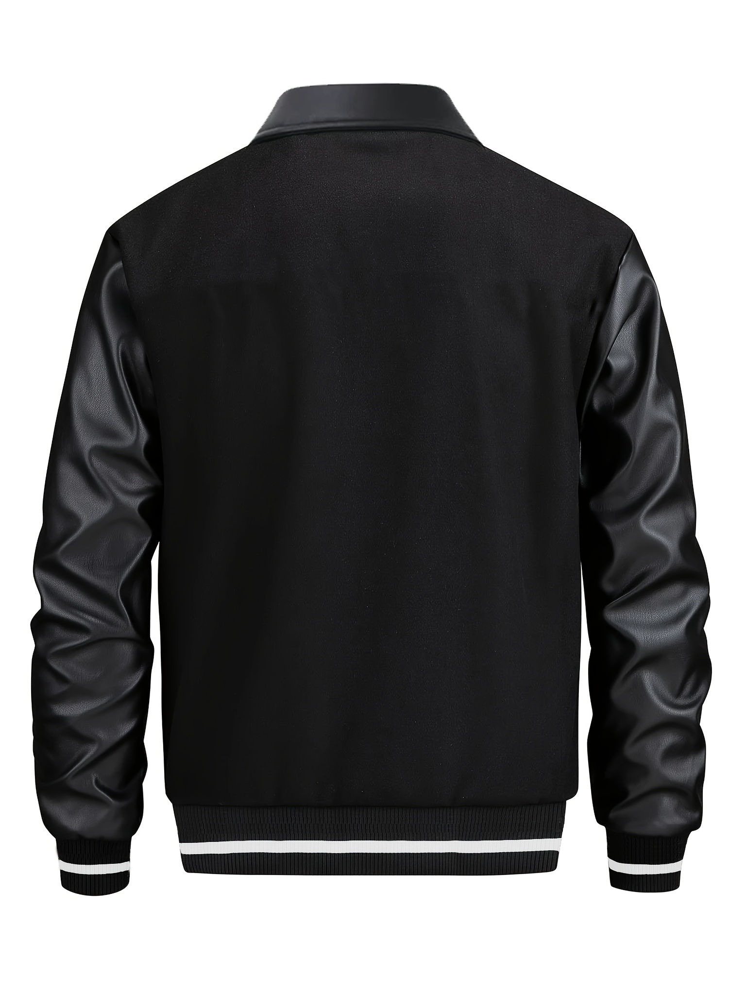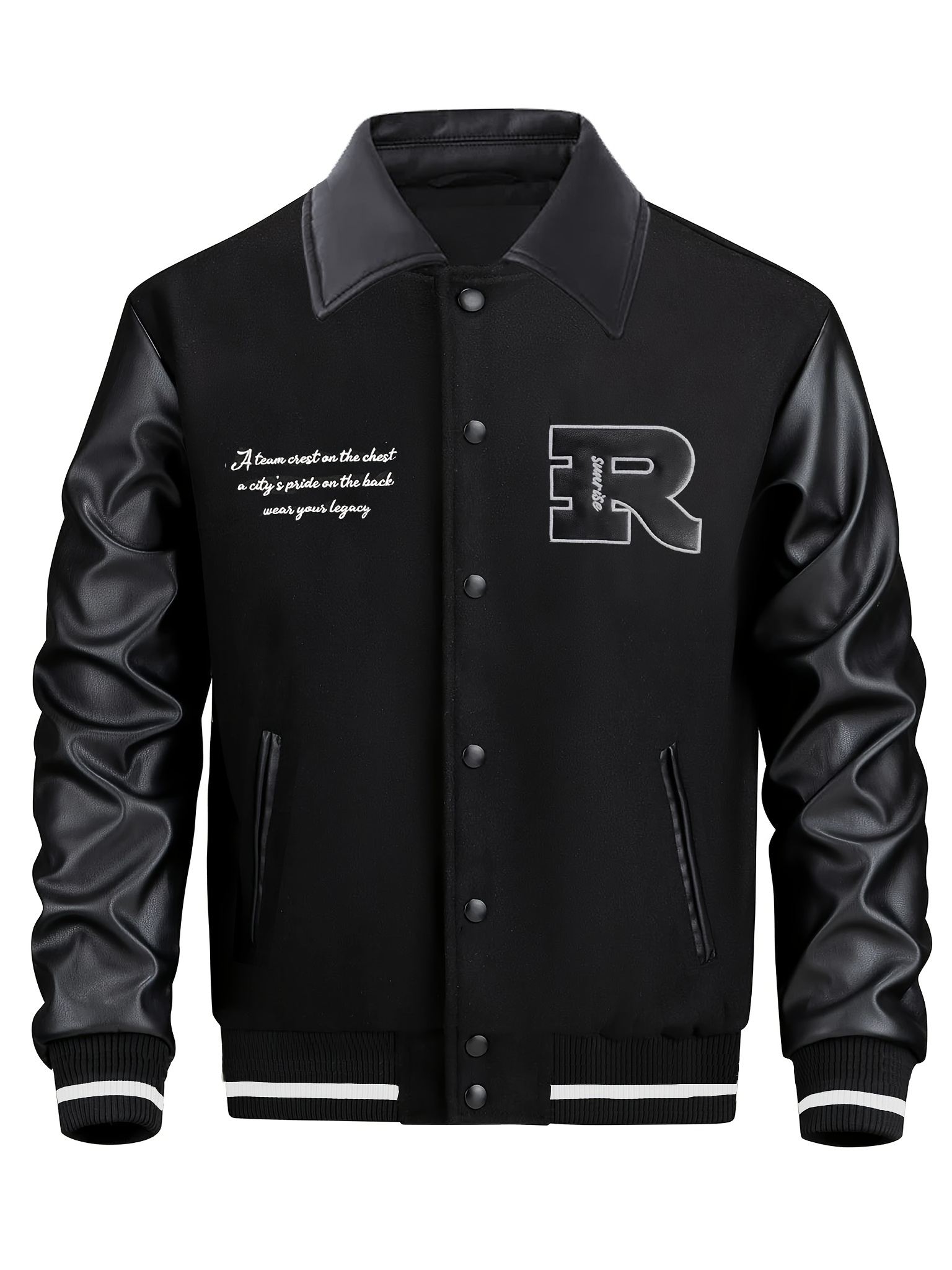 2025 Autumn Winter Men'S Black Baseball Jacket - High Street Embroidery, R Letter Patch