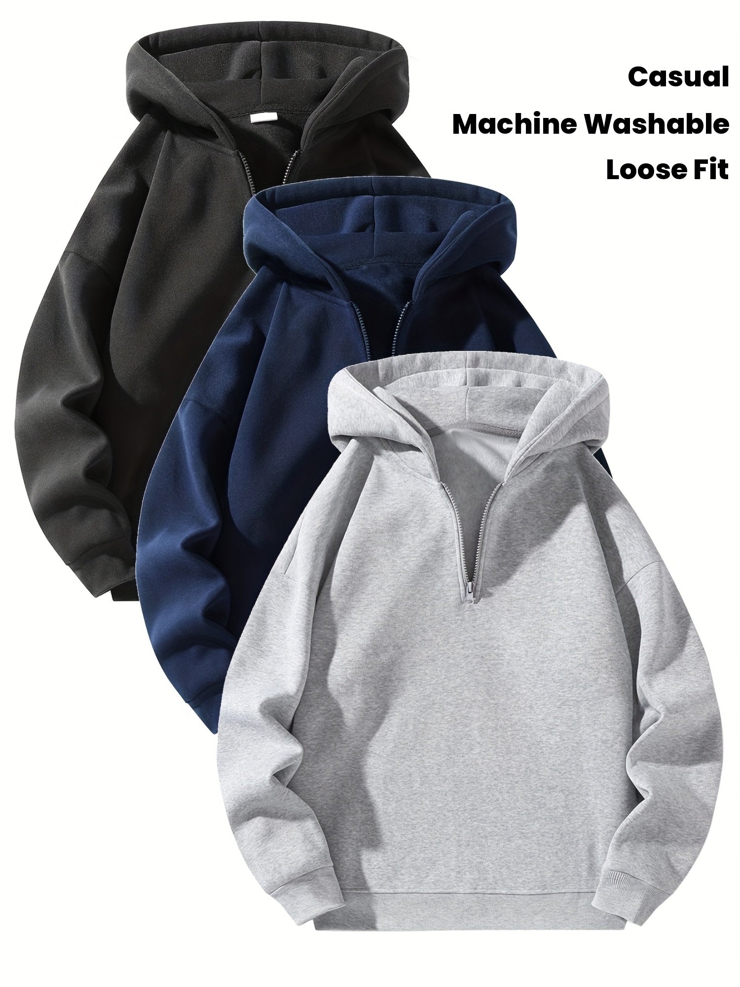 3pcs Fleece Hoodies 3pcs Men's Fleece-Lined Half-Zip Hooded Sweatshirts