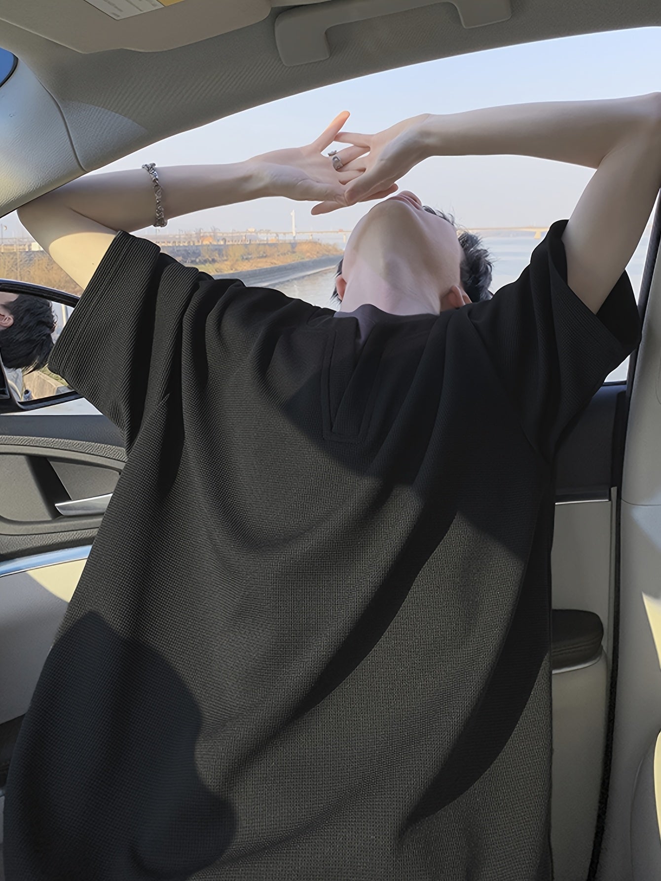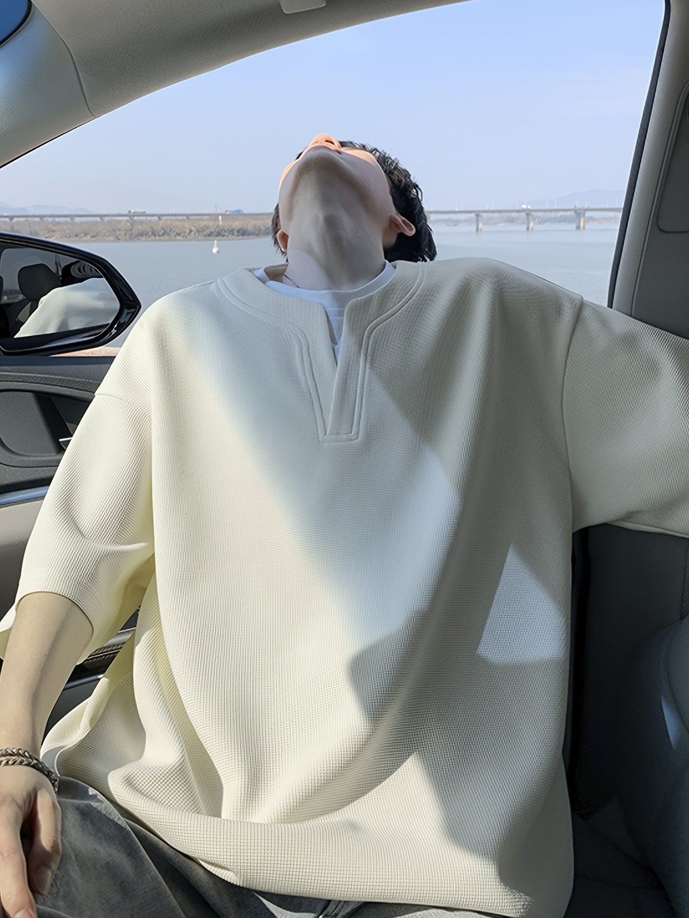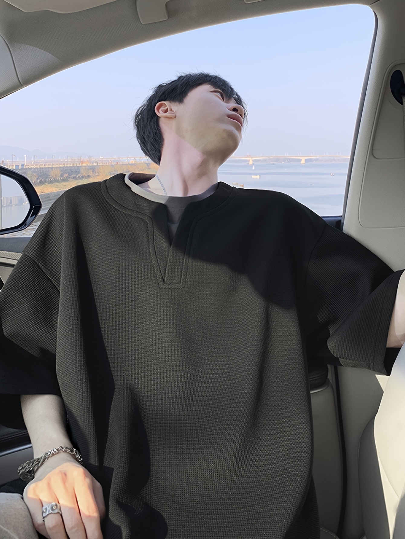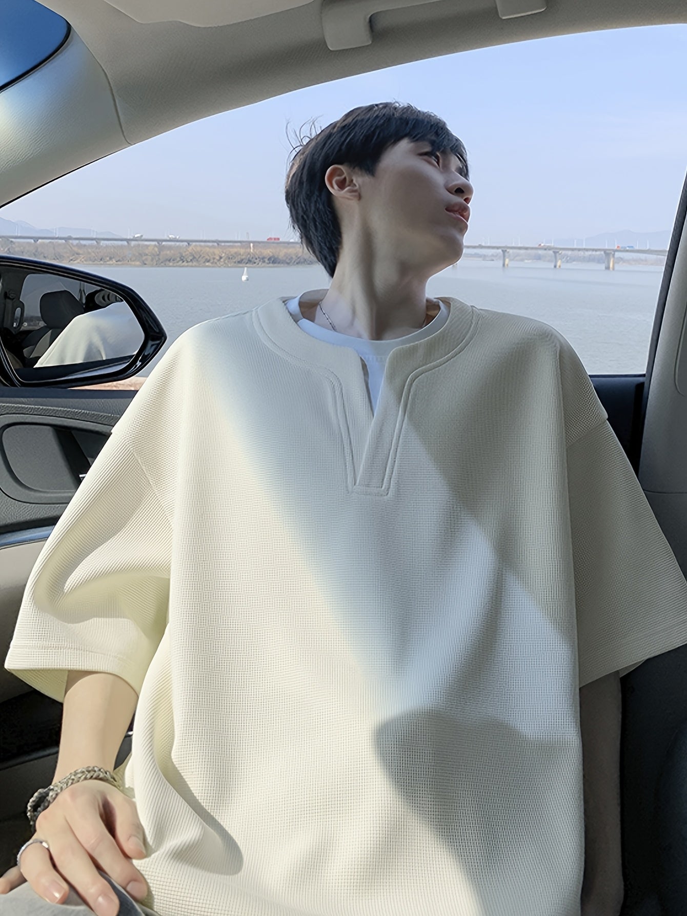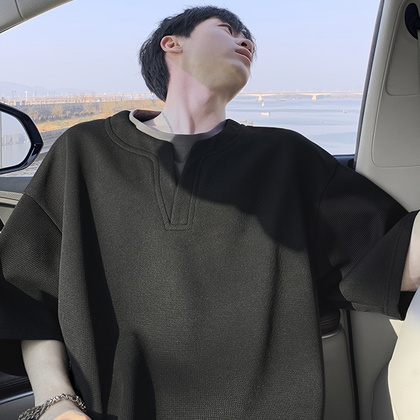 Casual T-Shirt OBM Men's Casual V-Neck Short Sleeve T-Shirt | Loose Fit Waffle Fabric, Solid Color with Contrast Trim