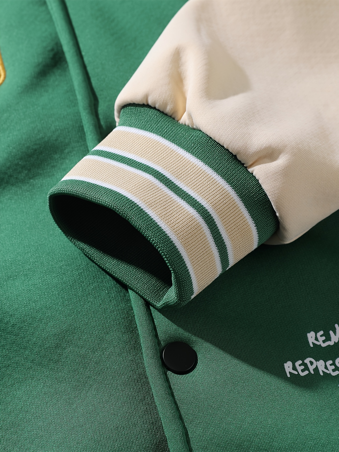 Men'S Casual Hooded Baseball Jacket with Embroidered Lettering, Color Block Design, Snap Closure