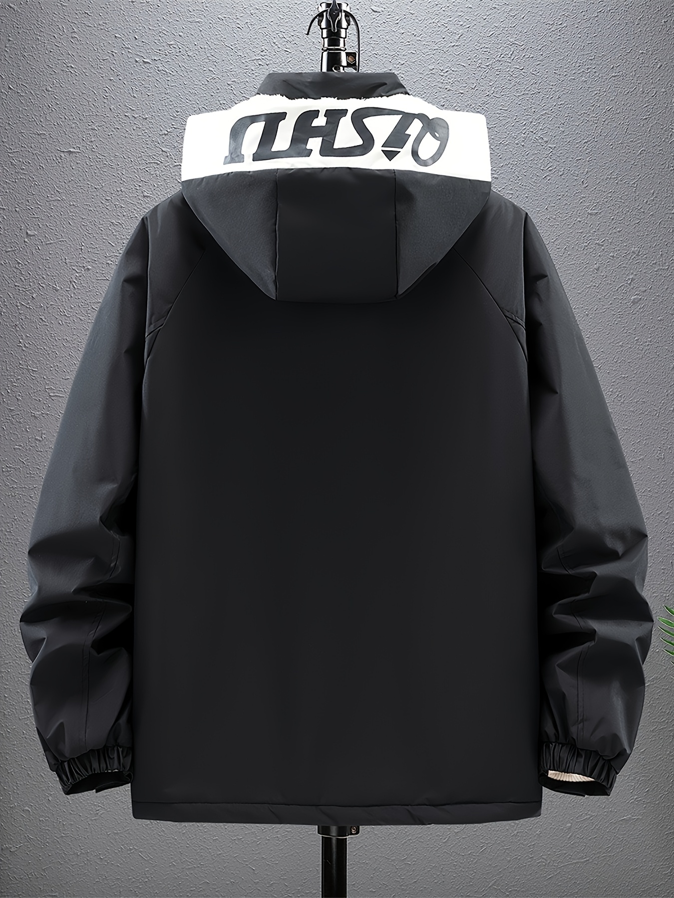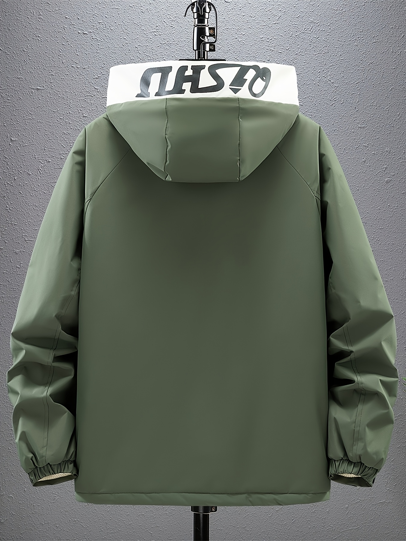 Men's Sporty Fleece-Lined Hooded Jacket - Two-Tone Olive Green & White with Contrast Stripes